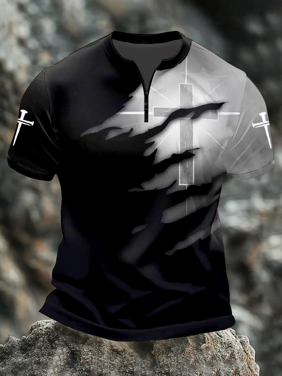 Men's Faith Glowing Cross Print Zipper T-shirt