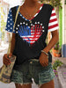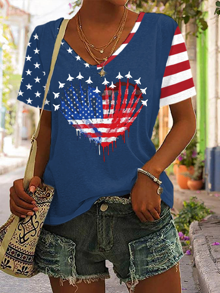 Women's 4th Of July Fighter Jet Patriotic USA Flag Heart Print Casual V-Neck Tee