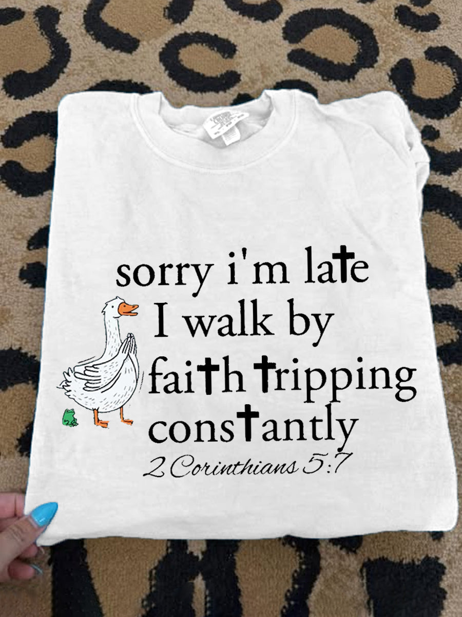 Women's Funny Sorry I’m Late I Walk By Faith Tripping Constantly Bible Verse Print Casual Tee