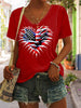 Women's Independence Day American Flag Heart Fireworks Casual V-Neck Tee