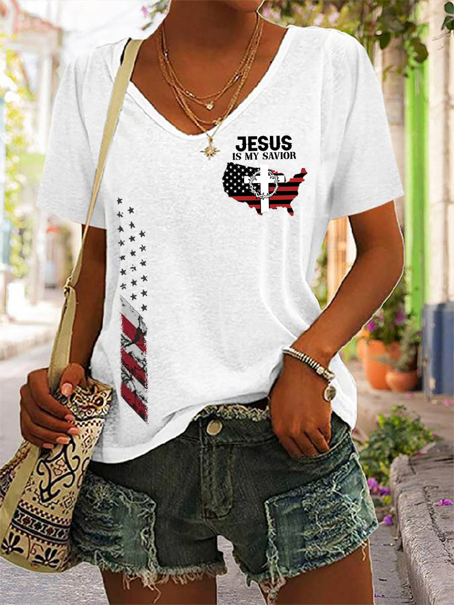 Women's Jesus Is My Savior American Flag Print Casual V-Neck Tee