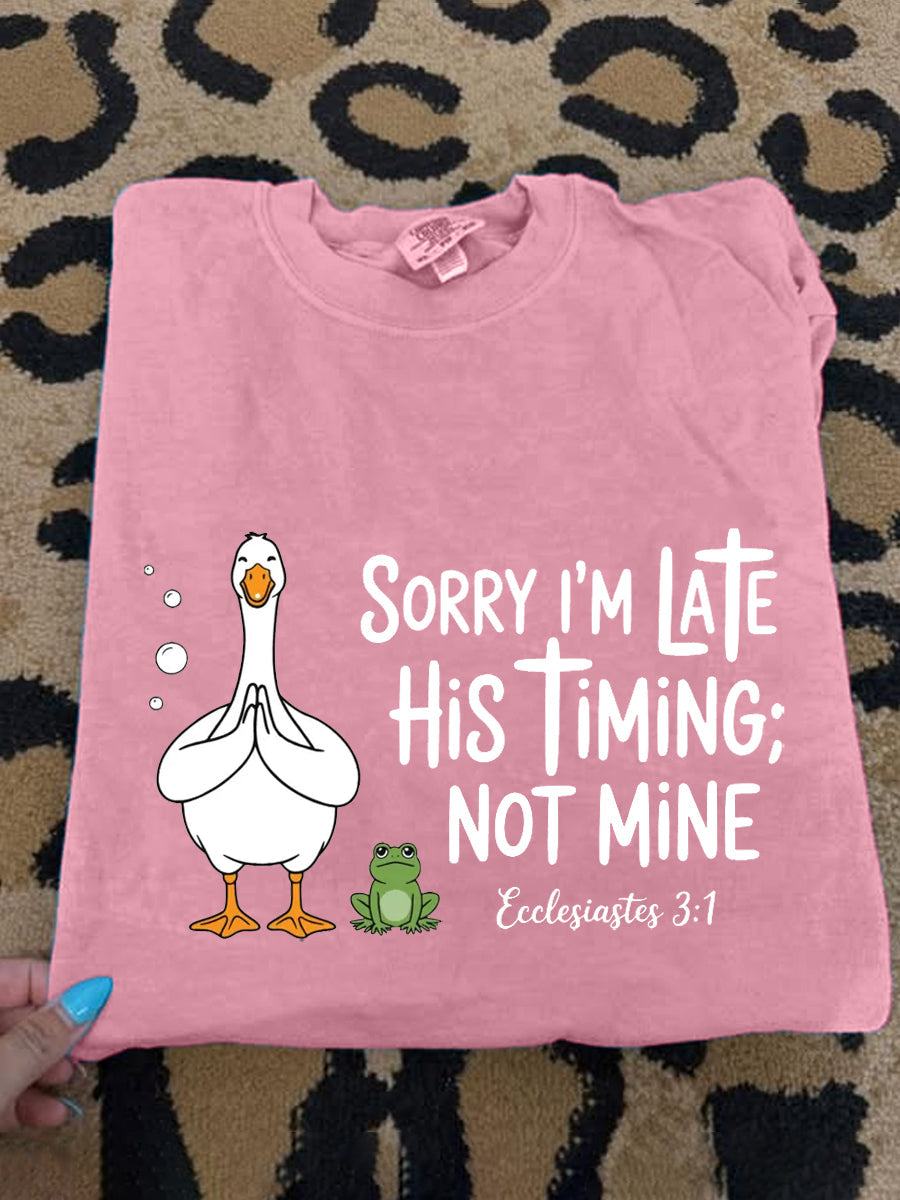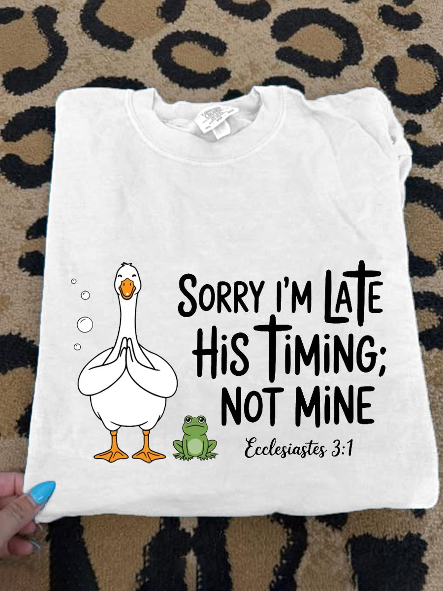 Women's Sorry I'm Late His Timing Not Mine Ecclesiastes 3:1 Funny Silly Goose Print Religious Humor Tee